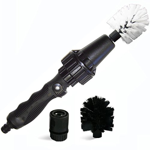 The Brush-Hero is a very impressive device. The brush head rotates continuously with a surprising amount of torque. Water exits the Brush Hero at a strong enough velocity to clean the brush and wash the surface being cleaned. It is extremely effective on automobile wheels, especially ones that are prone to heavy break dust accumulation. I have found that the brush head with the (softer) black bristles works best on wheel surfaces. The softer bristles are extremely efficient at sweeping away break dust and road grime with very little effort. The long handle enables you to get the inner surfaces of the wheel and in between the "spokes" without getting break dust or grease all over your hands. I have used the Brush Hero for a variety of other applications with similar effectiveness. I have used the device with the white brush to clean algae out of the corners of my pool and around the skimmer returns. It's also very effective for any sort of outdoor cleaning where you need surface pressure, but where a a pressure washer might cause damage -- painted surfaces around doors, window sills, window trim, gas grills, lawn furniture, etc. Finally, it is terrific for cleaning bicycles -- both the frame, cogs, chain, and other parts that are hard to reach. Brush Hero is a great product that lives up to its name.
